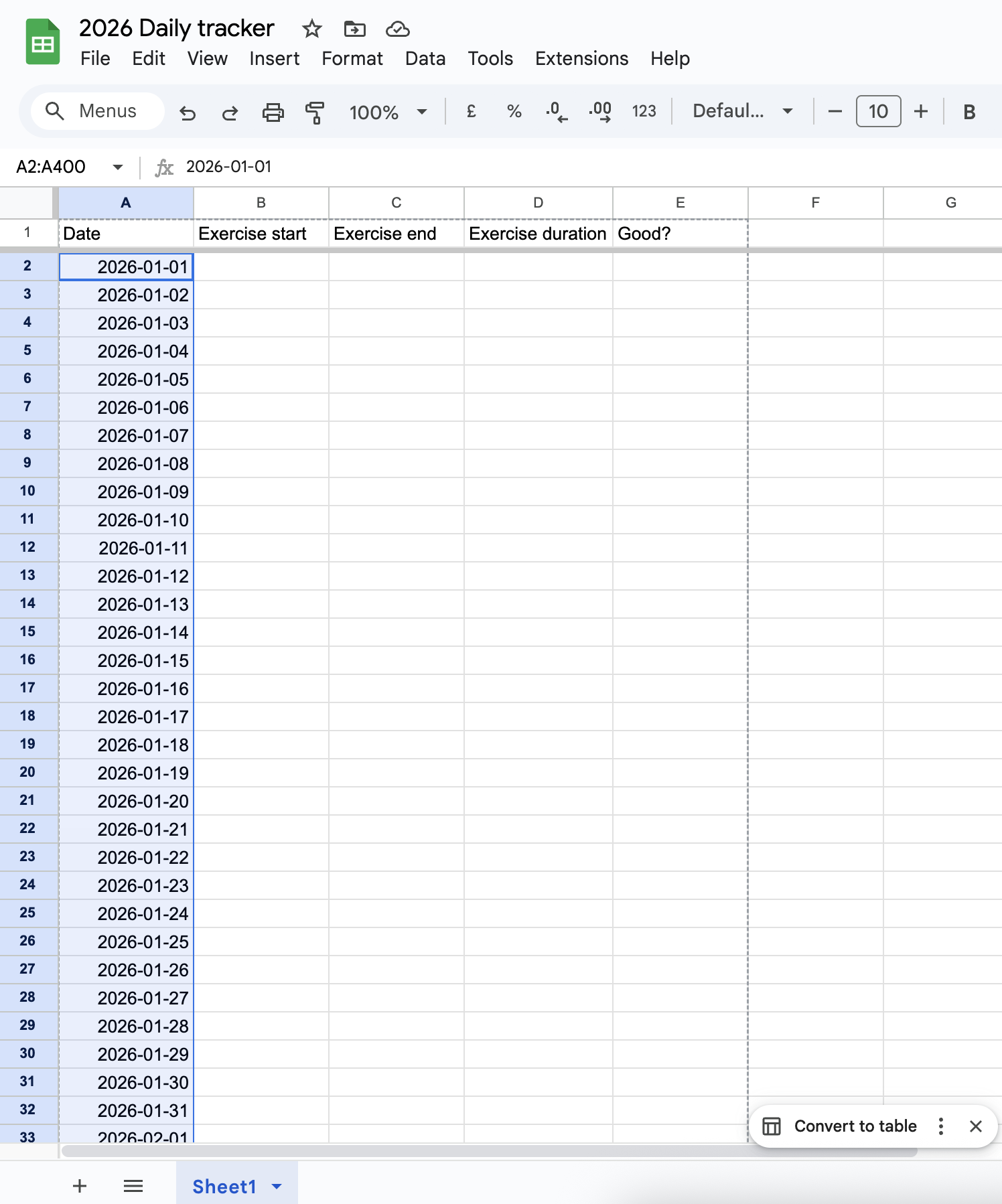 - Add the rows: type 2026-01-01 (or whatever date format) into cell A2, and drag down the bottom-right corner of the cell to extend it to more rows.