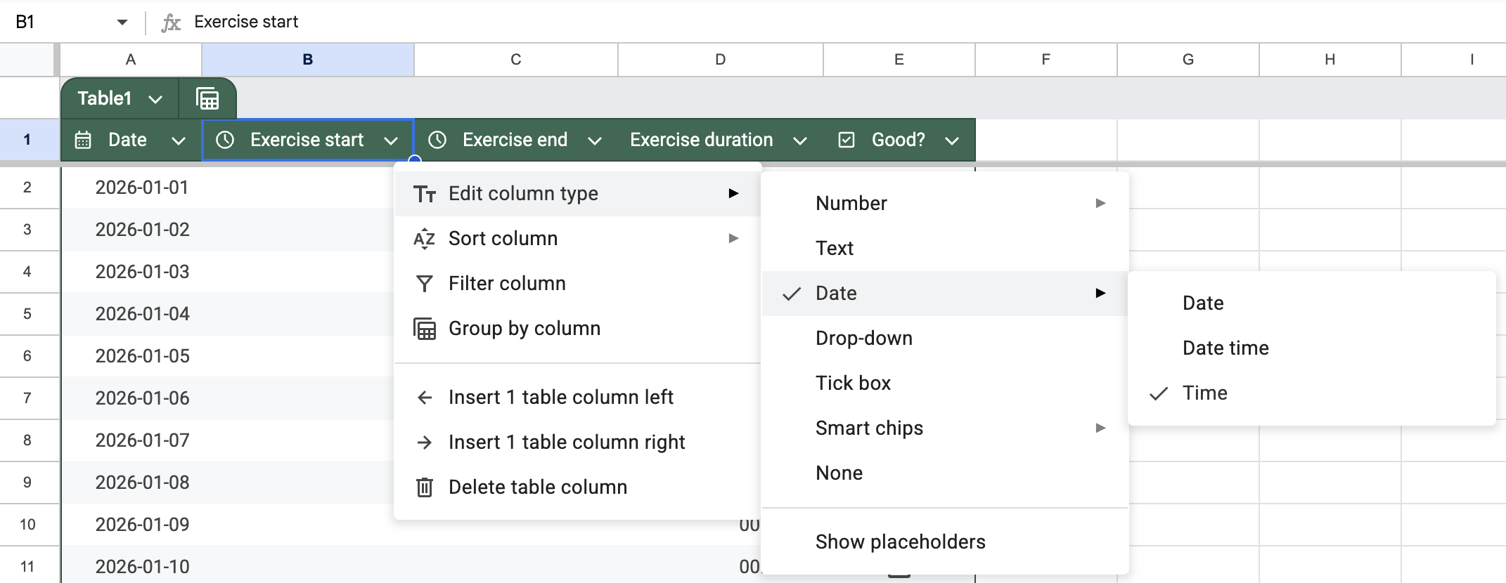 and for D2 (the “exercise duration”) enter the formula =C2 - B2 (difference between exercise start and exercise end), and let it auto-fill to the rest of the rows, and for column E, set type to “Tick box”:
