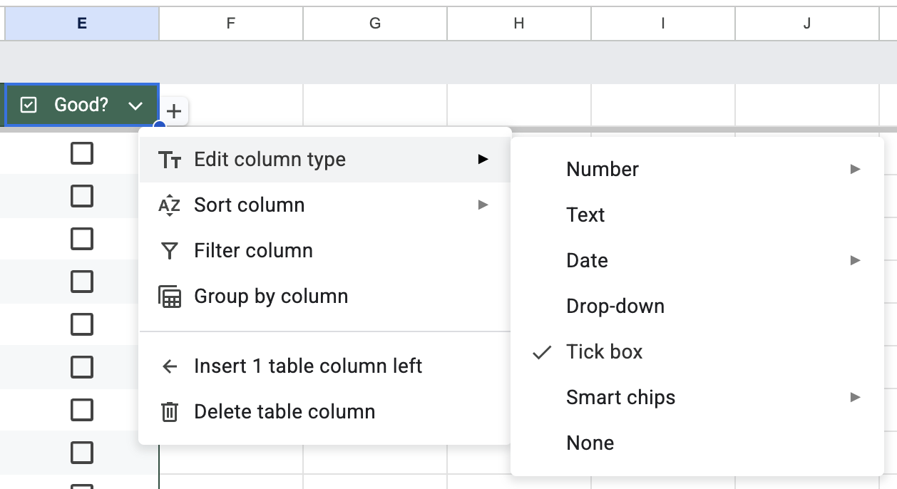 - Sheets offers to “convert to table”; go ahead and do that. Now “Edit column type” to pick “Time”,