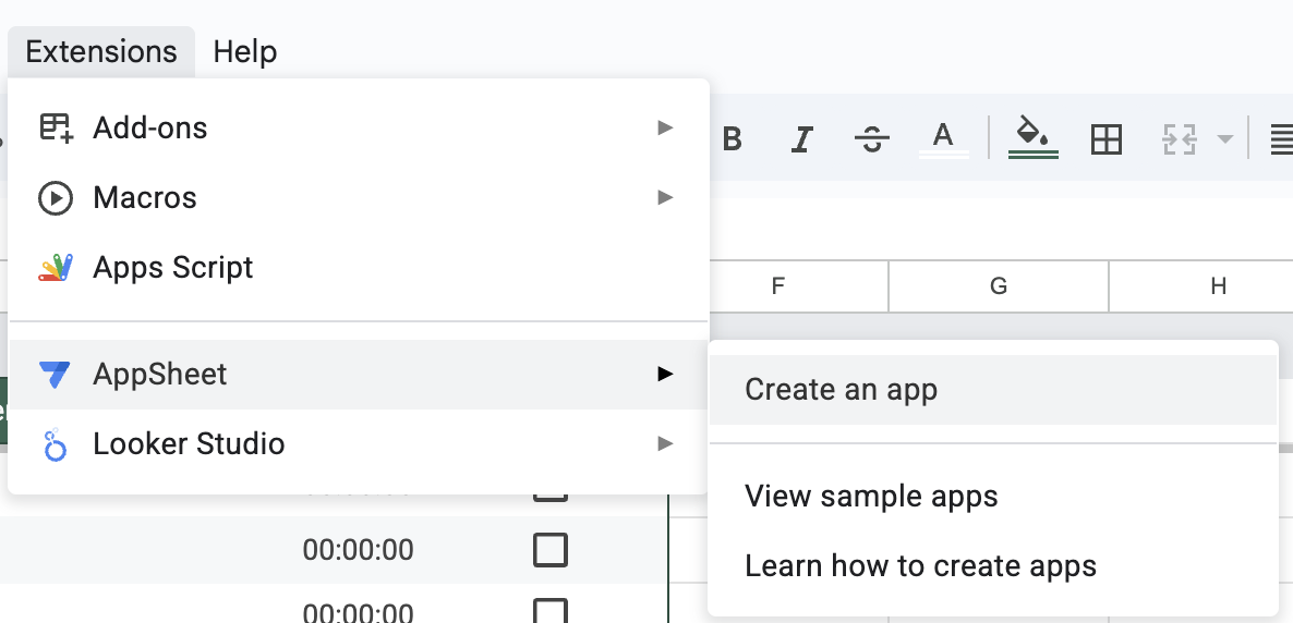 - Click on Extensions > AppSheet > Create an app