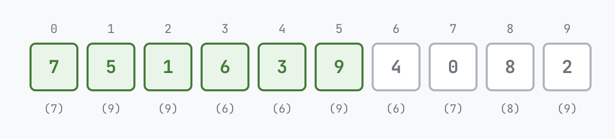 This visualization requires more explanation and the invariant is also harder to state. The number in parenthesis below each element shows the largest (or if going right-to-left, the smallest) element in the cycle it is part of.